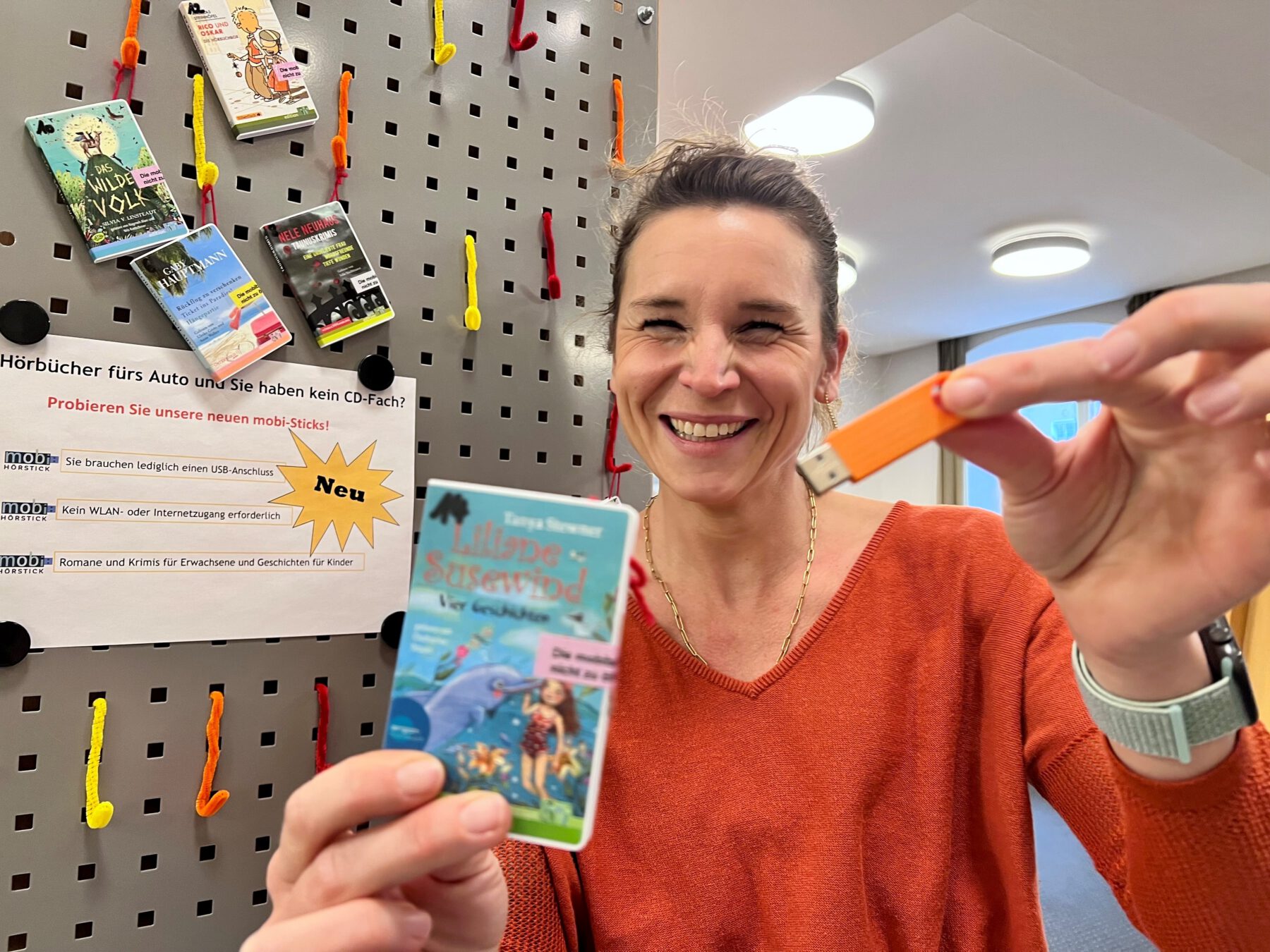Christin Moll mit den neuen USB-Sticks. Auf diesen sind Hörbücher für Kinder oder Erwachsene – perfekt für unterwegs.