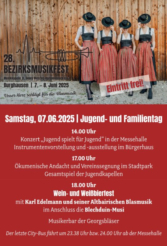 Das Bezirksmusikfest ist ein Höhepunkt im musikalischen Jahreskalender der Region – und lädt alle Musikbegeisterten herzlich ein, dieses besondere Wochenende in Burghausen zu genießen. Die Veranstalter freuen sich auf zahlreiche Gäste – bei jedem Wetter.