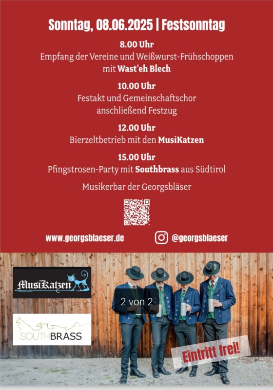 Der Sonntag, 8. Juni 2025, beginnt ab neun Uhr mit einem musikalischen Empfang und einem zünftigen Weißwurstfrühschoppen. Im Anschluss begeistert ein Gemeinschaftschor mit rund 1000 Musikerinnen und Musikern das Publikum. Höhepunkt ist der große Festzug mit Marschdarbietungen durch die teilnehmenden Kapellen – ein Erlebnis für alle Fans traditioneller Blasmusik. Danach wird im Bierzelt weitergefeiert: Dort sorgen die Musikatzen und Southbrass für beste Stimmung.