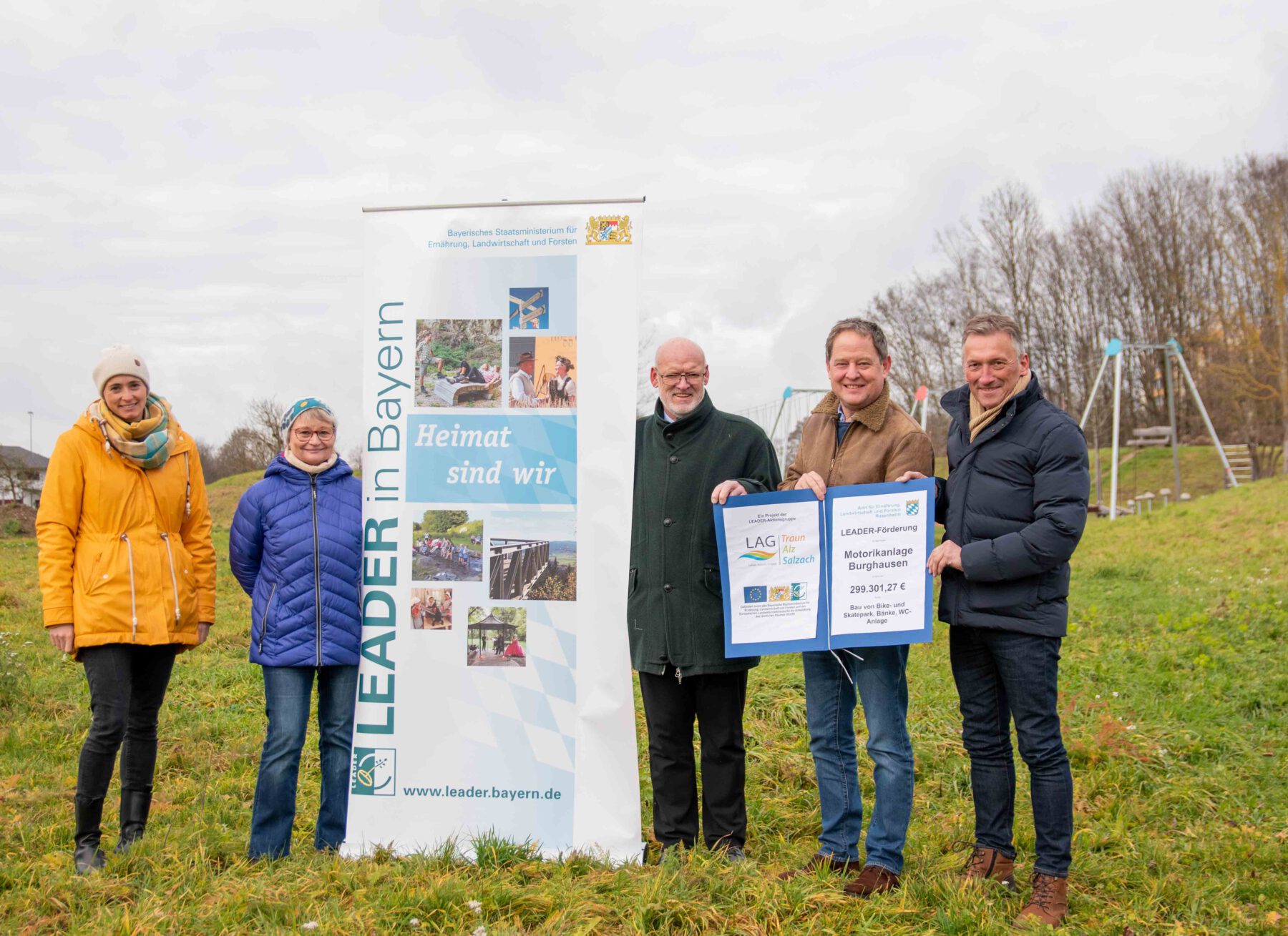 Burghausen. Bis jetzt gibt es nur eine große Wiese neben dem Motorikpark an der Berghamerstraße zu sehen. Bis zum Sommer 2023 sollen hier jedoch ein Bike-Park und ein Skate-Park entstehen. Dafür hat die Stadt eine Förderung bei LAG „LEADER Traun-Alz-Salzach“ beantragt und den Zuschuss jetzt bekommen. Mit fast 300.000 Euro unterstützt das Programm die Stadt Burghausen nun bei dem Bauprojekt, das insgesamt 584.000 Euro kostet. „Ich freue mich sehr über die Förderung von LEADER. Ohne diese Unterstützung könnten wir das Projekt nicht realisieren“, sagt Erster Bürgermeister Florian Schneider bei der Übergabe des Bescheids.