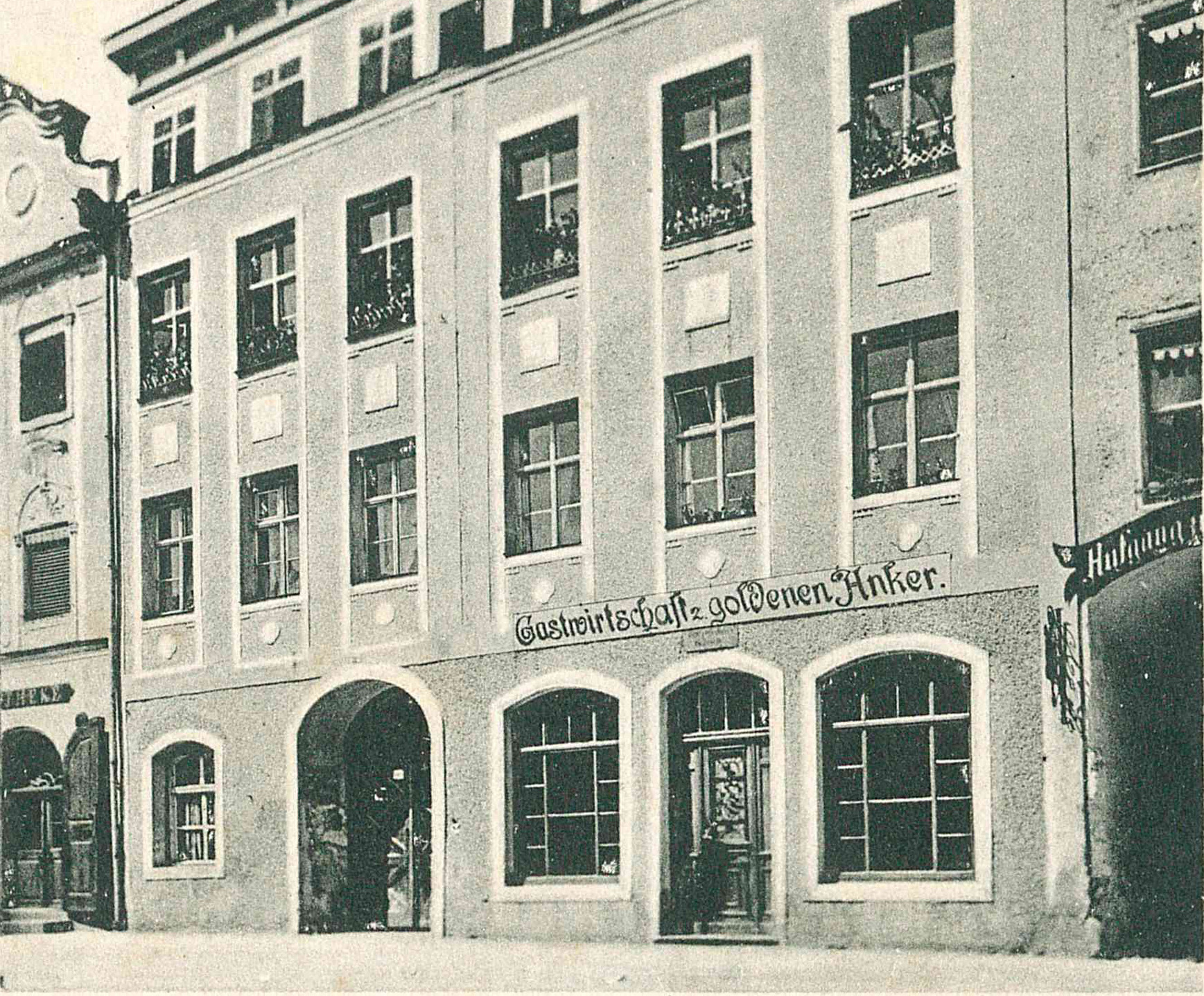 Doch warum heißt das Kino eigentlich „Ankersaal“? Im Laufe des 19. Jahrhunderts wurden die Häuser Nr. 41 und 42 zusammengelegt, das Wirtshaus änderte immer wieder den Besitzer und damit auch seinen Namen. Anfang August 1866 brannte das Haus komplett ab und wurde wiederaufgebaut. Das neue Wirtshaus trug den Namen „Goldener Anker“. Und dort spielte sich in den nächsten Jahrzehnten das gesellschaftliche Leben Burghausens ab. Im großen Saal des Wirtshauses, dem „Ankersaal“, fanden Feste und Bälle statt, jedoch auch Musterungen und Impfungen.