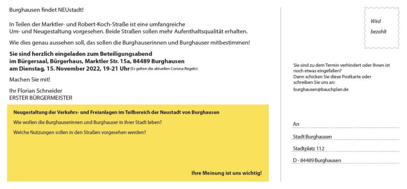 Alle Burghauser Haushalte erhalten in den nächsten Tagen eine Postkarte, die sowohl als Einladung als auch als Rückmelde-Instrument benutzt werden kann. „Falls also jemand nicht persönlich kommen kann, aber konkrete Wünsche oder Vorschläge hat, kann er diese entweder die Postkarte zurücksenden oder einfach eine E-Mail schreiben“, erklärt Werner Lechner, Leiter der Geschäftsstelle das Prozedere. Unter der Mailadresse burghausen@bauchplan.de kann Rückmeldung gegeben werden. Beide Antwortmöglichkeiten sind kostenfrei.