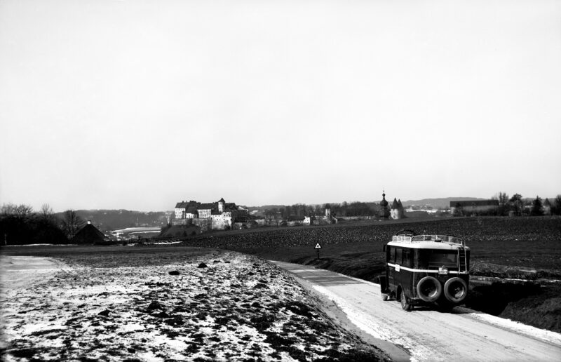 Postbus der Linie Braunau – Salzburg mit der Silhouette der Burghauser Burg im Hintergrund