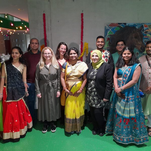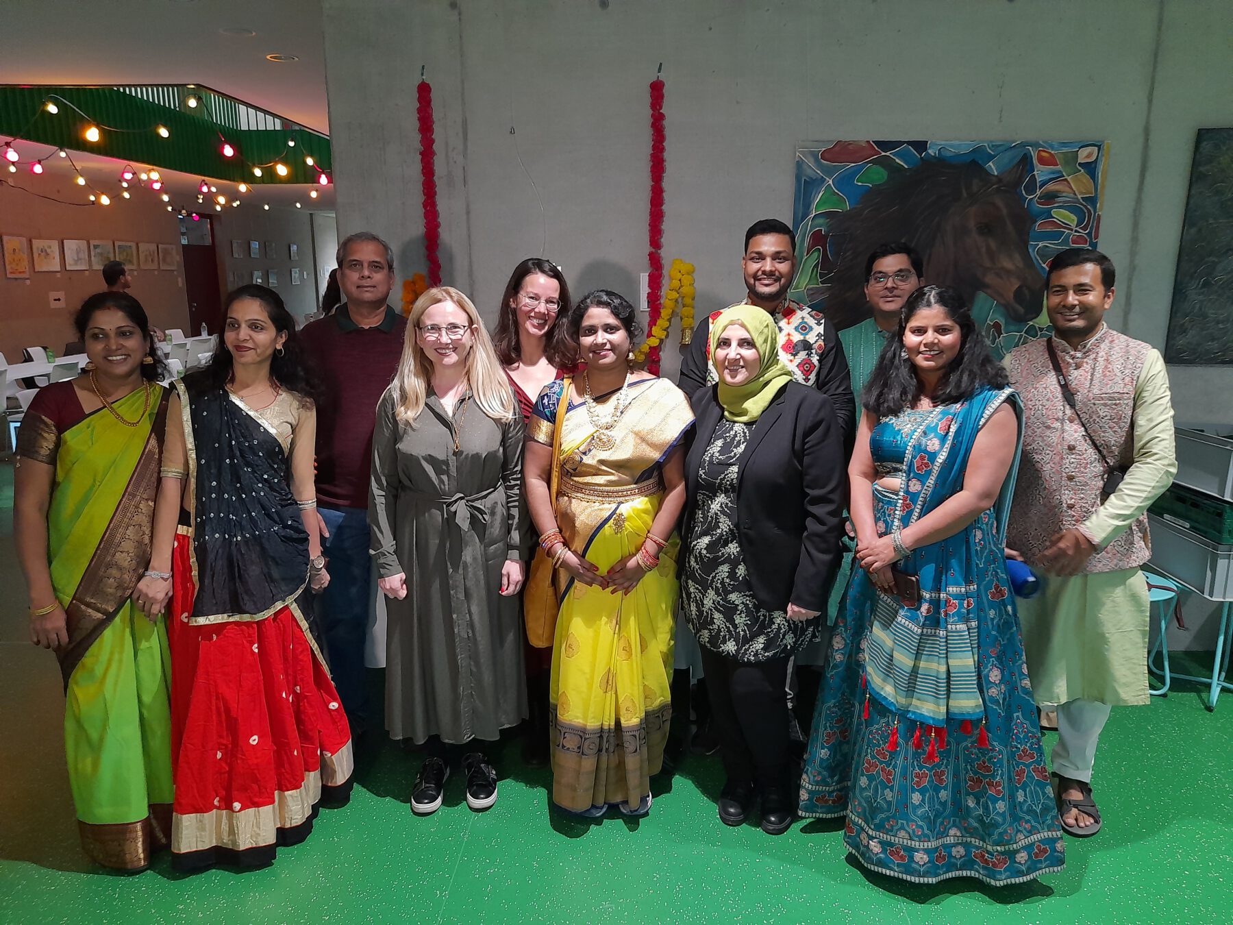 Izabella Incze und Haifa Ragab (Reihe vorne, dritte und fünfte von links) vom Integrationsbeirat planen mit Swati Gupta (vorne rechts) das Holi-Fest. Hier ist das Organisationsteam beim Indischen Lichterfest 2022 zu sehen.