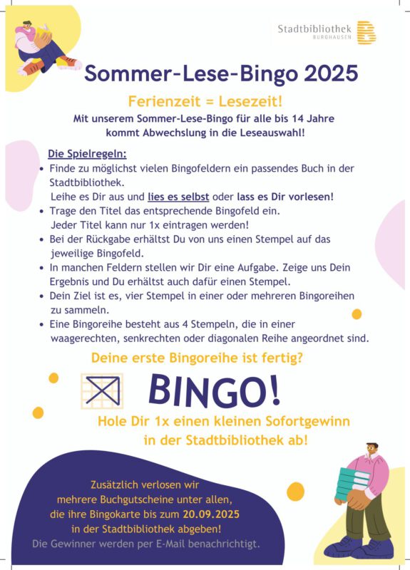 Ferienzeit ist Lesezeit! Passend zum Ferienbeginn in Österreich startet die Stadtbibliothek Burghausen bereits am Freitag, 4. Juli 2025, mit dem neuen Mitmachformat Sommer-Lese-Bingo für Kinder bis 14 Jahre. Das Angebot soll spielerisch zum Lesen, Vorlesen und Kreativsein motivieren – ganz ohne Leistungsdruck und mit der Chance auf kleine Preise und Buchgutscheine.