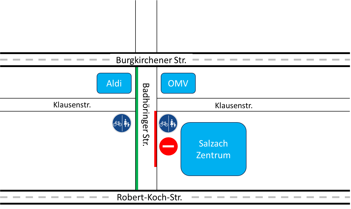 In der Zeit vom 6. September bis voraussichtlich 3. November 2023 muss der Rad- und Fußweg in der Badhöringer Straße zwischen Klausenstraße und Zufahrt Salzachzentrum auf der Seite des Salzachzentrums wegen Bauarbeiten gesperrt werden.