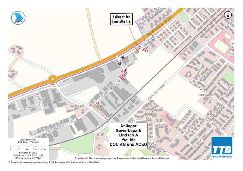 Der Verkehr wird während der Bauzeit über die Bachstraße beziehungsweise die Burgkirchener Straße umgeleitet. Verkehrsteilnehmende werden gebeten, den ausgeschilderten Umleitungen zu folgen. Mit einem erhöhten Verkehrsaufkommen im betroffenen Bereich ist zu rechnen.