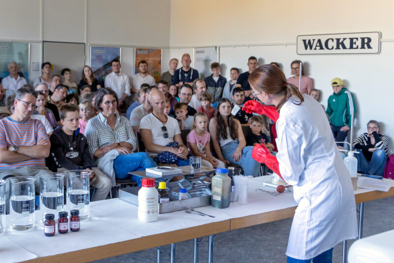 Am Eingang des Belegschaftshauses war die große Salzausstellung aufgebaut, die anlässlich des diesjährigen Jubiläumsjahres – 1000 Jahre Burghausen und 111 Jahre WACKER – gemeinsam mit der Stadt konzipiert wurde. Die Belegschaftsbücherei lud zum Stöbern und Schmökern ein und Experten von WACKER kamen mit den Besuchern an den Informationsständen ins Gespräch über die Themen Energie, Nachhaltigkeit, Sicherheit, Gesundheit, Personalwesen und Betriebsrat. Auch die Standortfirmen Westlake Vinnolit GmbH und Siltronic AG stellten ihre Unternehmen vor. Auf der Bühne des Festsaals wurde es futuristisch – im dortigen Innovationsbereich zeigten KI-gestützte Roboter ihr Können und die autonomen Transportfahrzeuge Starship und der Roboterhund SPOT mischten sich unters Publikum. Für großen Andrang und Begeisterung sorgte auch die Science Show der WACKER-Chemiker, die mit ihren verblüffenden Versuchen und alltagstauglichen chemischen Tricks Jung und Alt in Atem hielten. Ähnlich heiß ging es bei den Löschübungen der Werkfeuerwehr zu, die zusätzlich zu den feurigen Vorführungen auch am Dorfnerweg ihren beachtlichen Fuhrpark ausstellten. Das kam vor allem bei den Kindern gut an, die sich obendrein noch im Animationsbereich austoben konnten.