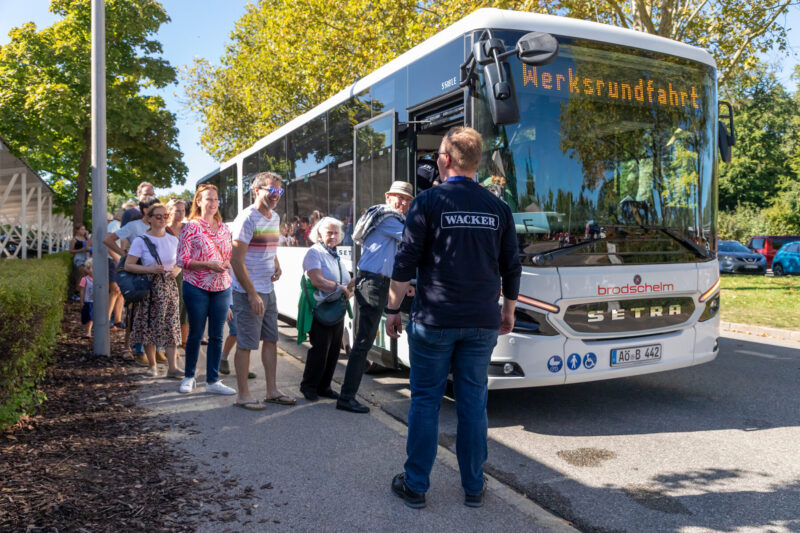 Die Busse waren im Dauereinsatz, um die Besucher zu rund 200 Betriebsbesichtigungen und Werkrundfahrten ins Werk zu bringen. Darunter waren die Alzwerke, die Polysilicium-Produktion, das Logistikzentrum, Chemielabore, Werkstätten und Anlagen zur Herstellung von Siloxan und Dispersionspulver. Auf der Bühne begrüßten Werkleiter Peter von Zumbusch und Betriebsratsvorsitzender Manfred Köppl offiziell die Gäste. Es folgte ein abwechslungsreiches Programm, bei dem sowohl WACKER-Familien als auch Mitarbeiter zu Wort kamen, die ihre Berufsbilder vorstellten – von der Chemikantin im Reinraum über den Notarzt bis zum KI-Spezialisten und der Gesamtbetriebsführerin im Salzbergwerk Stetten. Musikalisch umrahmt wurde das Bühnenprogramm von der WACKER-Werkkapelle. Vorstandsvorsitzender Christian Hartel und Florian Schneider, Erster Bürgermeister von Burghausen standen im Interview zum Thema „Stadt und Industrie“ Rede und Antwort. „Wir wissen, was wir aneinander haben“, beschrieb Florian Schneider das besondere Verhältnis zwischen Burghausen und WACKER.