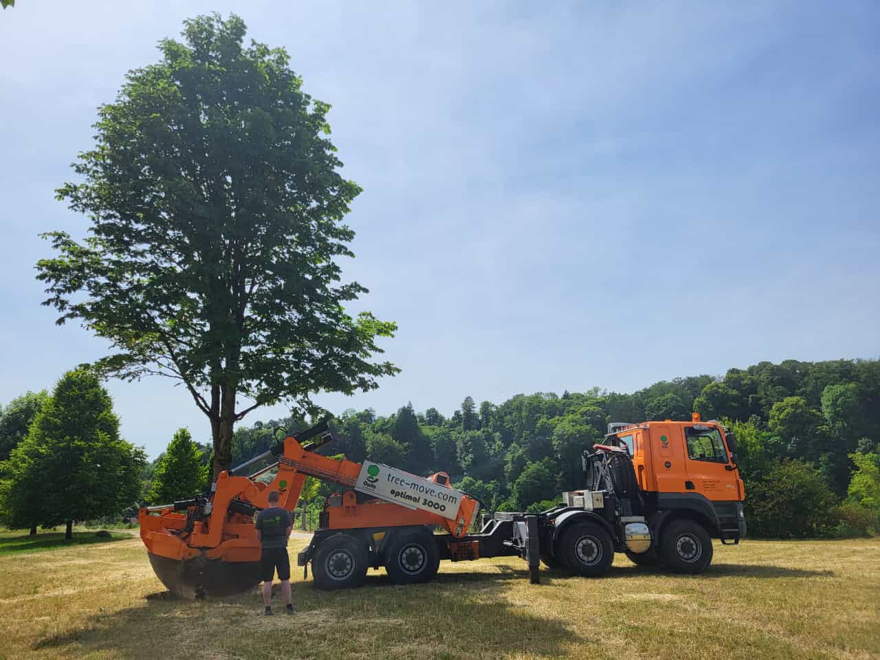 Die Erfolgsquote bei der Verpflanzung liegt übrigens bei 97 %. Allerdings muss die Verpflanzung auch gut vorbereitet werden. Die Bäume müssen zum Beispiel im Vorfeld ausgiebig gewässert werden. Zum einen, damit die Spezialmaschine den ganzen Wurzelballen leichter greifen kann, zum anderen damit der Baum keinen Schaden nimmt, wenn er eine Zeit lang nicht versorgt ist. Außerdem müssen angrenzende Bäume vielleicht teilweise zurückgeschnitten werden, damit der Baum herausgehoben werden kann. Der neue Standort muss ebenfalls vorbereitet werden. Die Spezialmaschine hebt mit dem Greifer das Loch aus, damit der Wurzelballen Platz findet.