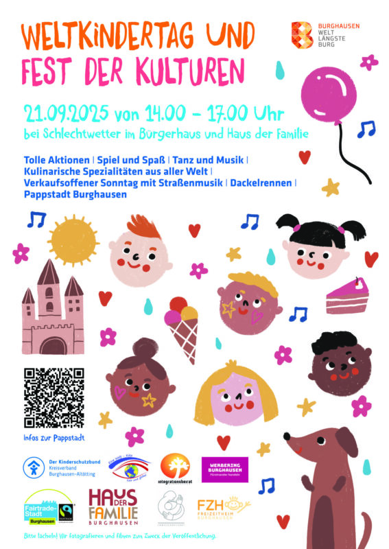 Am Sonntag, den 21. September 2025 lädt die Stadt Burghausen, der Werbering und zahlreiche Vereine und Ehrenamtlichen zum Weltkindertag und Fest der Kulturen mit verkaufsoffenen Sonntag nach Burghausen ein. Ein großes Angebot aus Musik, Workshops, kulinarischen Köstlichkeiten und Attraktionen erwartet die Besucher an diesem Sonntag.