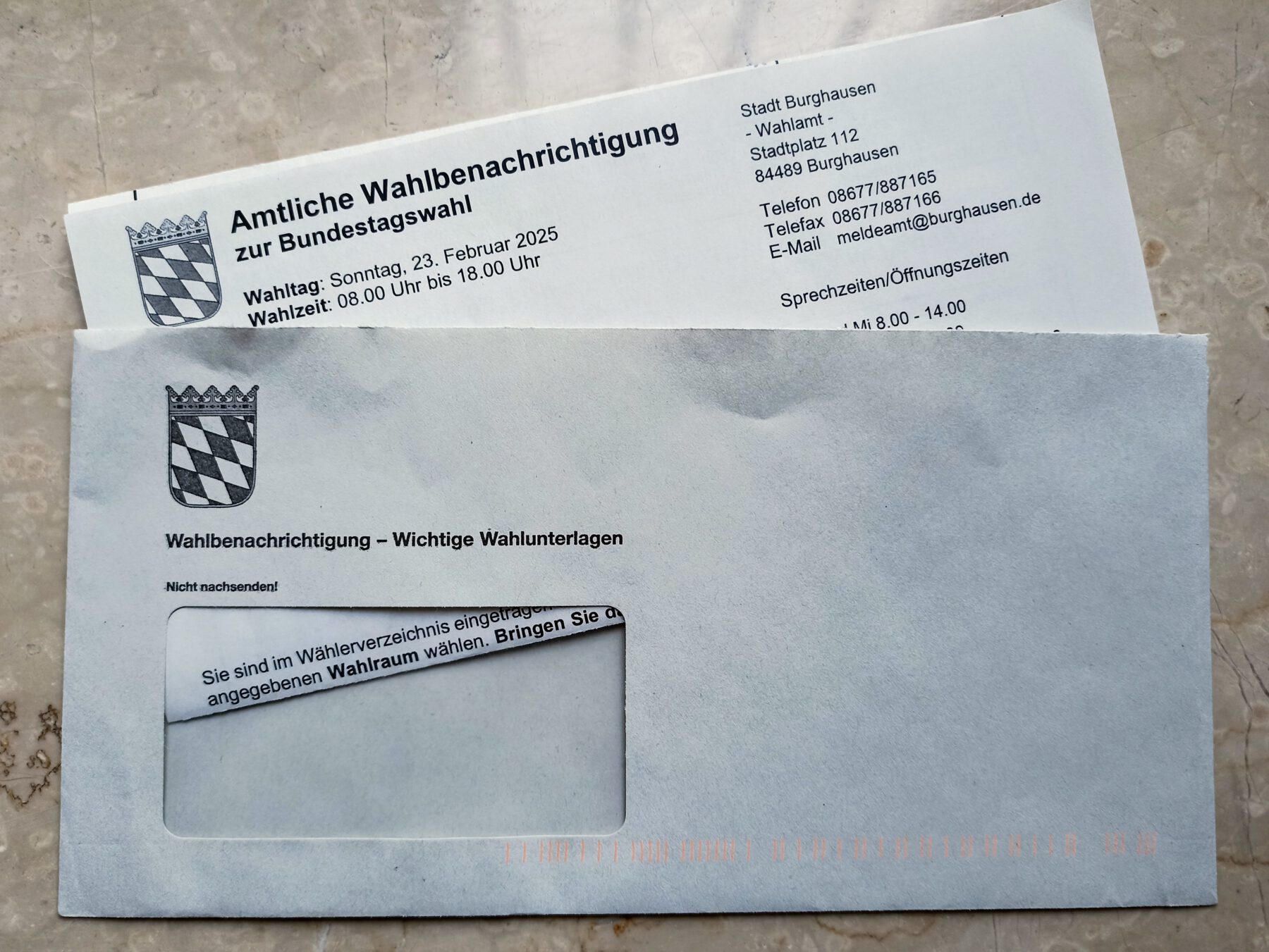 Die Online-Beantragung über den auf der Wahlbenachrichtigung aufgedruckten QR-Code oder über die Homepage der Stadt Burghausen ist bis 19.02.2025 weiterhin möglich. Bitte nutzen Sie diesen Service, mit dem Sie einfach und schnell die Briefwahlunterlagen beantragen können.