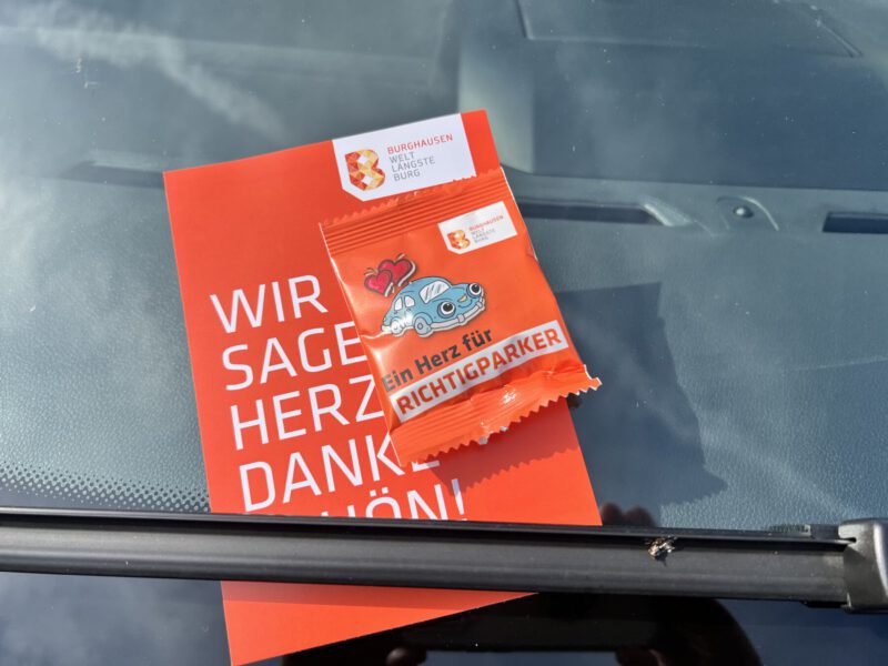 Burghausen. Die Verkehrsüberwacher der Stadt Burghausen machen einen guten und vor allem vielfältigen Job. Zu den Aufgaben der sechs Verkehrsüberwacher in Voll- und Teilzeit gehören neben dem Ausstellen von Strafzetteln: Bring- und Besorgungsdienste aller Art, Kontrolle des Stadtgebiets auf Reinheit, Schließdienste z.B. beim Botanischen Garten, Schreiben für Anwohner verteilen, Unterstützung bei Großveranstaltungen wie beim Public Viewing, die Sicherheit und Ordnung zu gewährleisten, aber auch Parkplatz-Einweisungen z.B. bei der Bürgerversammlung. Die Verkehrsüberwacher sind dem Ordnungsamt und damit seinem Leiter Martin Hinterwinkler unterstellt. Letzterer hatte kürzlich eine schöne Idee: Ab dem Burgfest-Wochenende 2024 gibt es in Burghausen regelmäßig ein „Dankeschön“ für Richtigparker auf die Windschutzscheibe in Form einer Postkarte und Gummibärchen-Herzen.