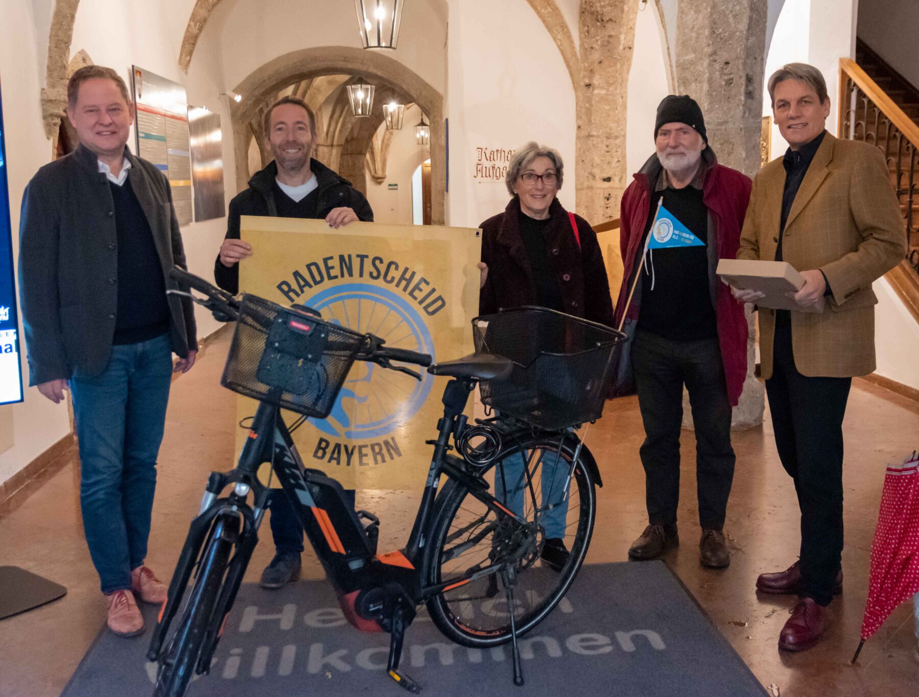 Erster Bürgermeister Florian Schneider (v.l.), Dritter Bürgermeister Stefan Angstl, Anna Schierenberg, Aktionsbündnis Verkehrswende Altötting, Ernst Spindler, Bund Naturschutz Ortsgruppe Burghausen, Peter Áldozó, Grünen-Kreisvorsitzender und Ansprechpartner Radentscheid in Burghausen bei der Übergabe der Unterschriften im Rathaus.