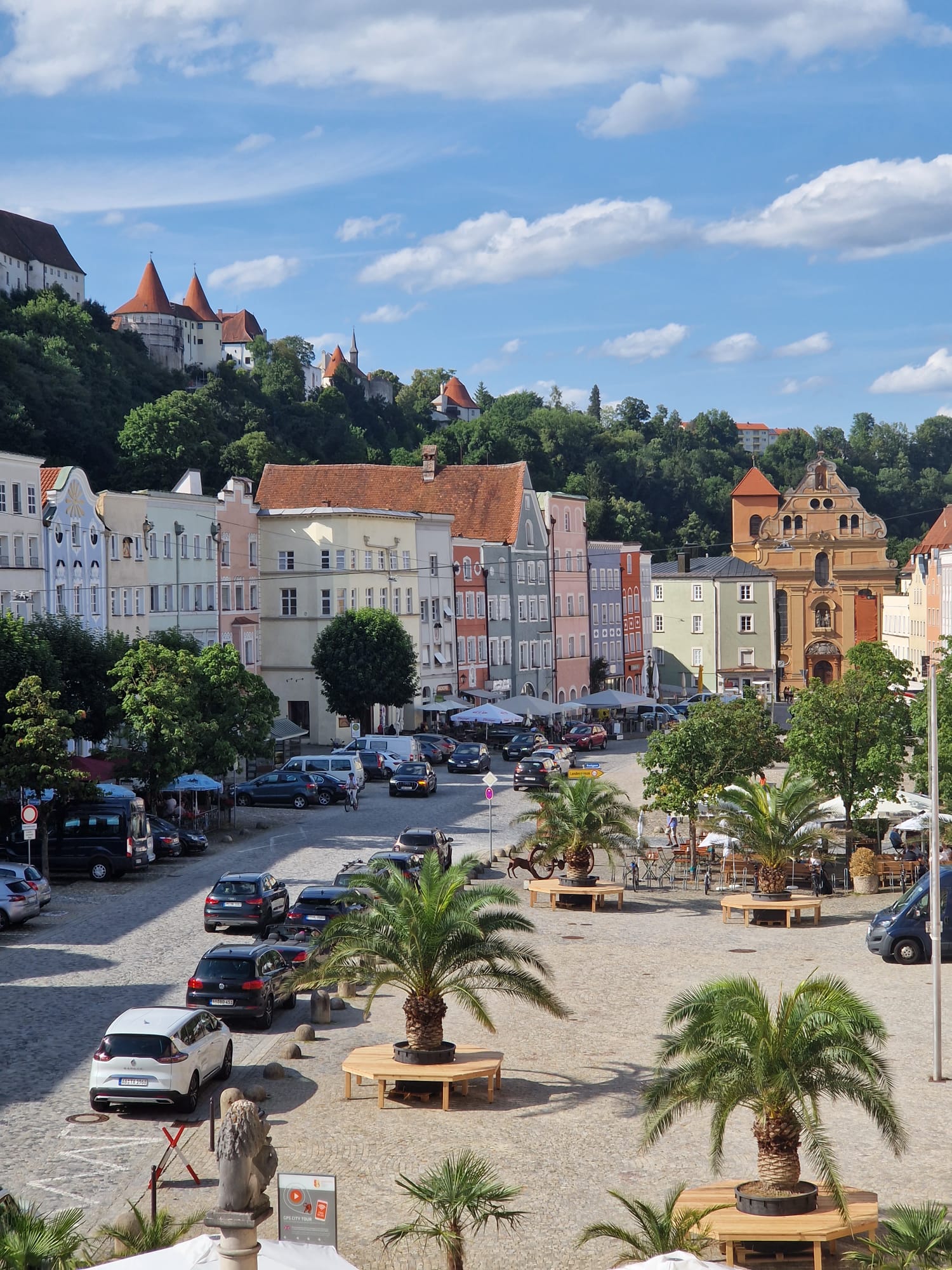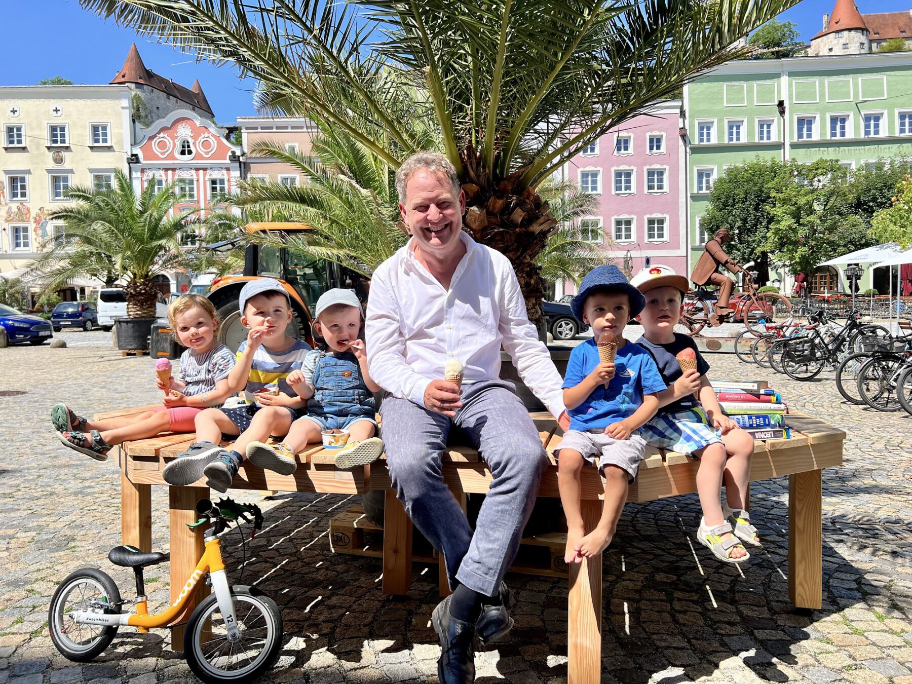 Mehr Burghauser Urlaubsfeeling geht nicht. Das fanden auch die Burghauser Altstadt-Kids, die am Stadtplatz zum Fotoshooting vorbeigekommen sind: Selma, Luca, Jonas, Theodor und Simon. Bürgermeister Schneider hat den Kindern gerne ein Eis spendiert. Die haben Eis, Palmen und Holzsitzband an ihrem Stadtplatz jedenfalls für gut befunden.