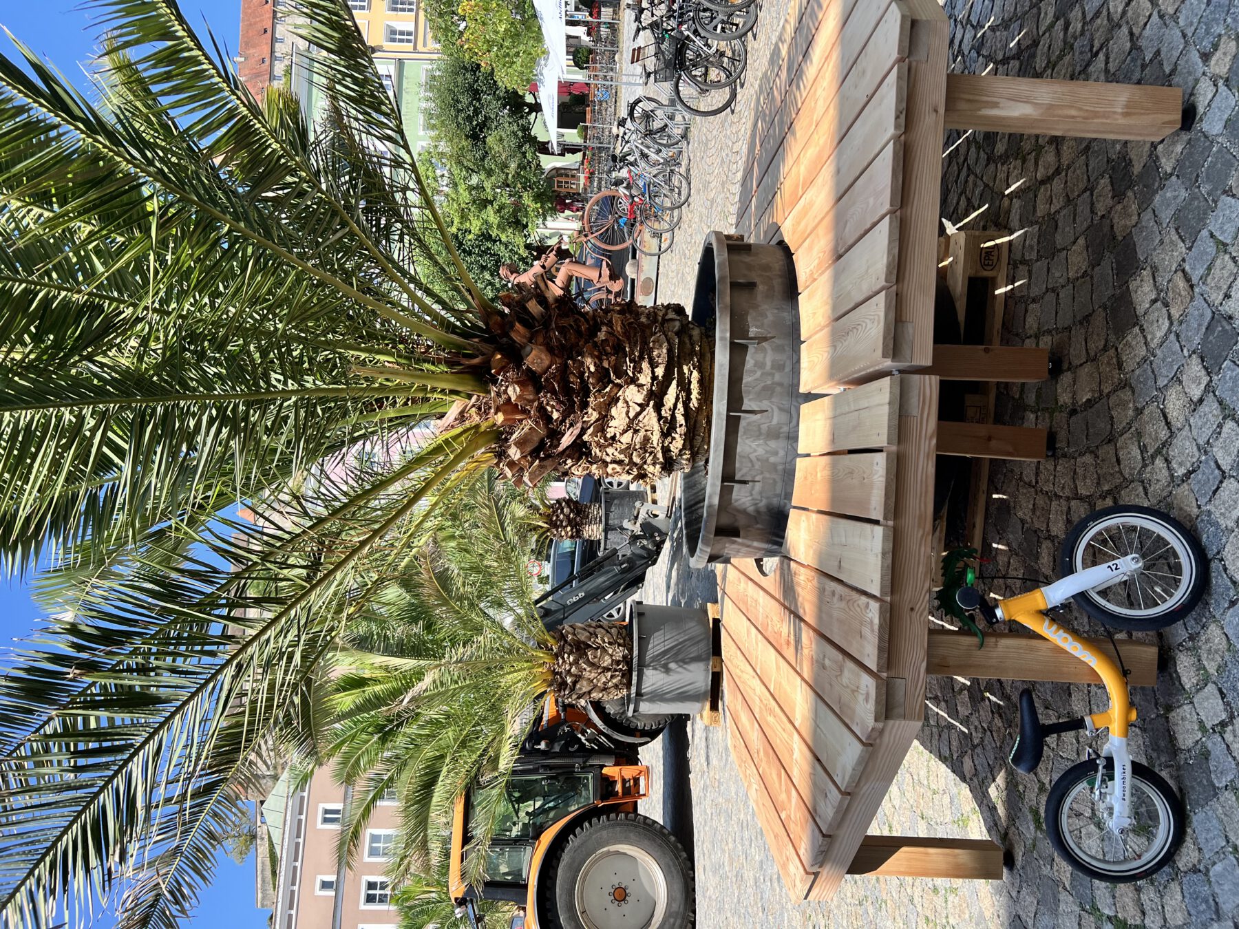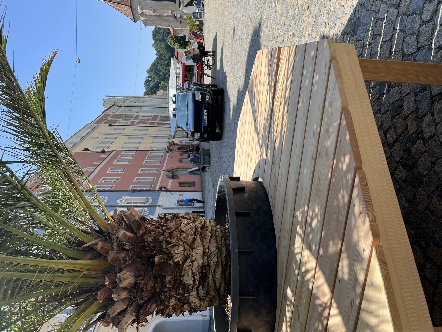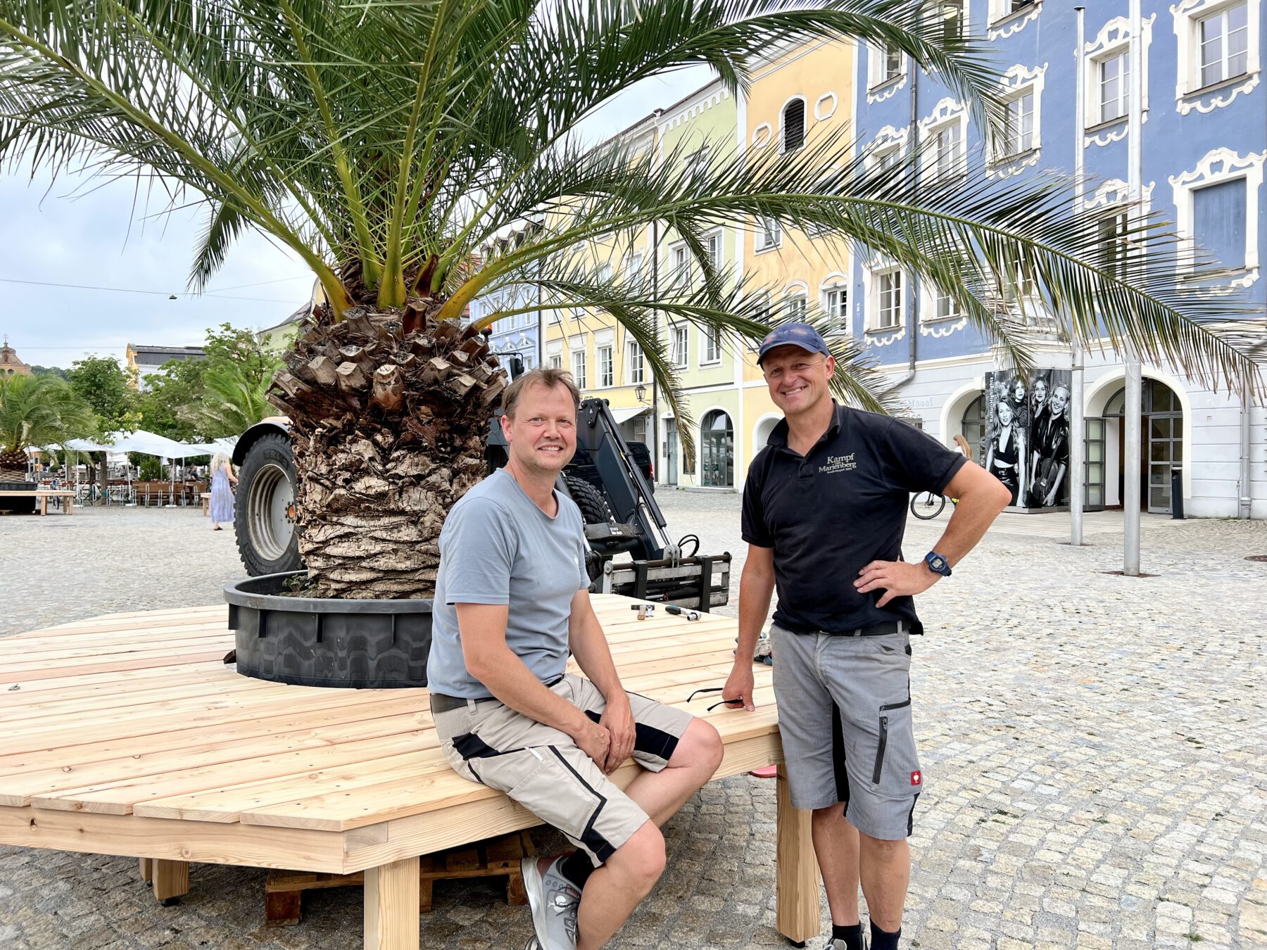Seit Dienstag stehen am Burghauser Stadtplatz fünf gut sichtbare, große Palmen. Sie umgibt jeweils ein Achteck aus Holz. Die Oktogone haben die städtischen Schreiner Christoph Bonauer und Markus Salzinger im Bauhof aus heimischer Lärche gefertigt. Passgenau umschließen sie die Plamen, die aus Bad Füssing stammen. Die Idee zum städtischen Palmenhain am Stadtplatz hatte Bauhofleiter Peter Schweikl. Zusammen mit Erstem Bürgermeister Florian Schneider ist er nach Niederbayern zum Palmen kaufen gefahren. „Ich fand die Idee klasse. Die Palmen mit den schönen Sitz- und Liegemöglichkeiten steigern die Aufenthaltsqualität am Stadtplatz und sehen einfach gut aus. Die Pflanzen sind nachhaltig beschafft und können von uns überwintert werden“, sagt das Stadtoberhaupt.
