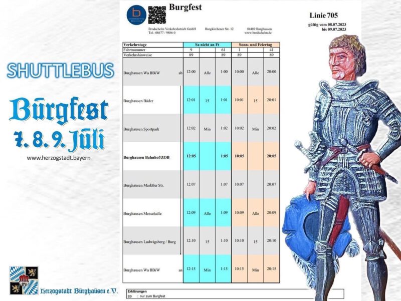Mit einem kostenfreien Pendelbusverkehr, abrufbar unter www.burghausen.de, werden alle großen Parkflächen angeschlossen. Der Veranstaltungsbus verkehrt kostenfrei!