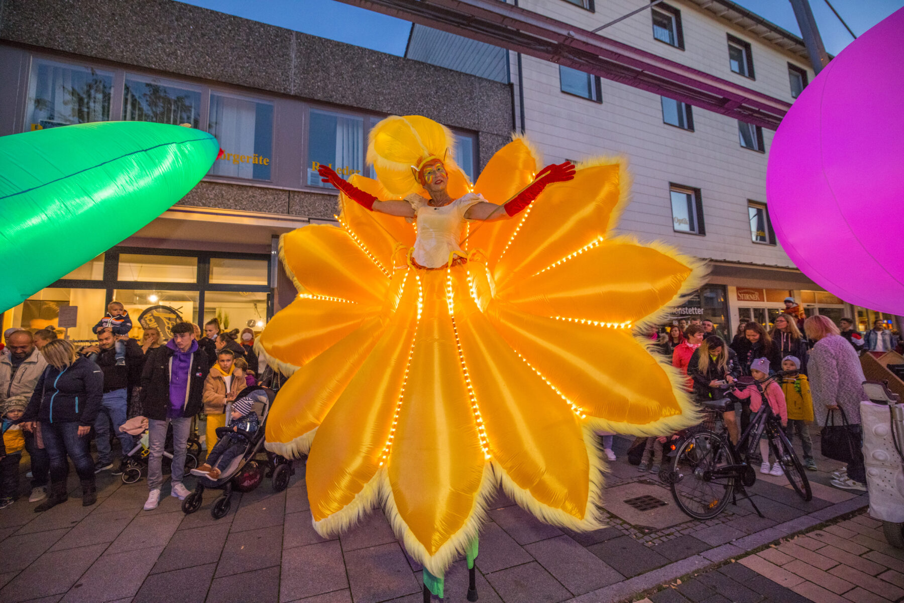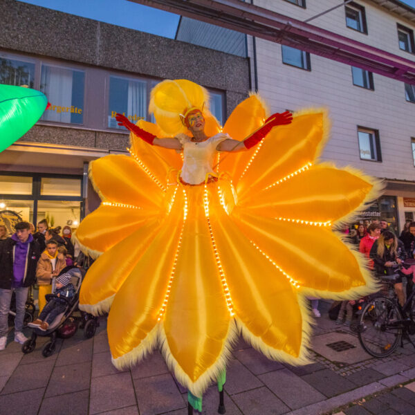 Auf den Straßen überraschen hochkarätige Walk Acts die Besucher: Riesige Wesen auf Stelzen ziehen mit ihren leuchtenden und fantasievollen Kostümen durch die Einkaufsstraßen.