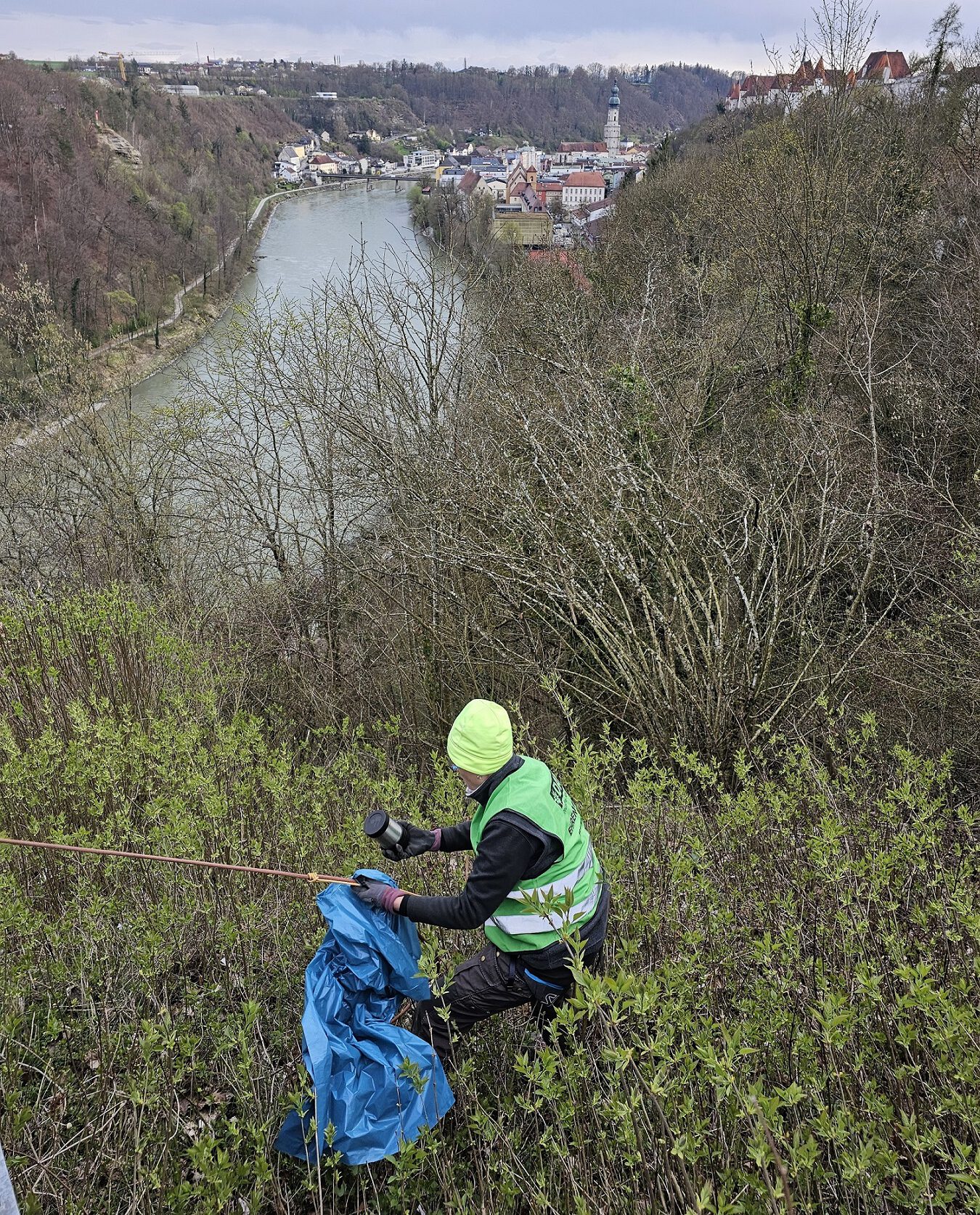 „Ich gehe viel in Burghausen spazieren und vor allem am Aussichtspunkt über der Salzach ist es mir in letzter Zeit besonders aufgefallen, dass dort inzwischen ganz schön viel Müll liegt“, berichtet Dorothea Friemel vom Natur- und Umweltschutz-Team des DAV während sie sich ihren Klettergurt umschnallt. Deswegen haben sich Friemel und die beiden FÖJlerinnen zusammengetan und die Aktion gestartet.