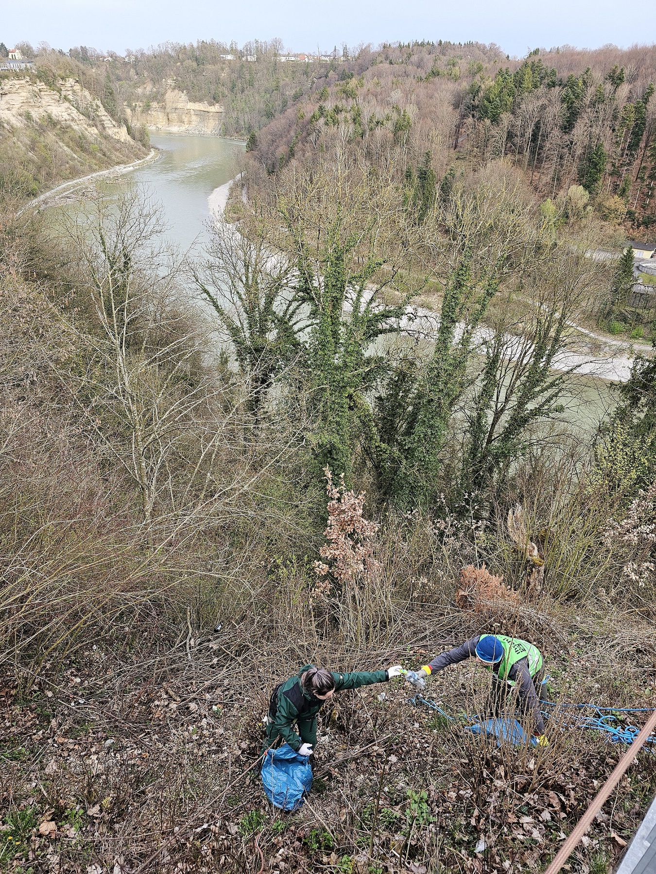 Ganz schön weit nach unten geht es am Ernst-Mittermeier-Steg, doch das hält einige mutige Kletterer nicht davon ab, dort am steilen Salzachhang Müll zu sammeln. Drei Mitglieder der Ortsgruppe Burghausen des Deutschen Alpenvereins (DAV) sowie Ariane Wacker, die gerade ihr freiwilliges ökologisches Jahr (FÖJ) im Umweltamt absolviert, seilten sich kürzlich von der Aussichtsplattform ab. Drei volle Müllsäcke brachten sie am Ende wieder mit nach oben.