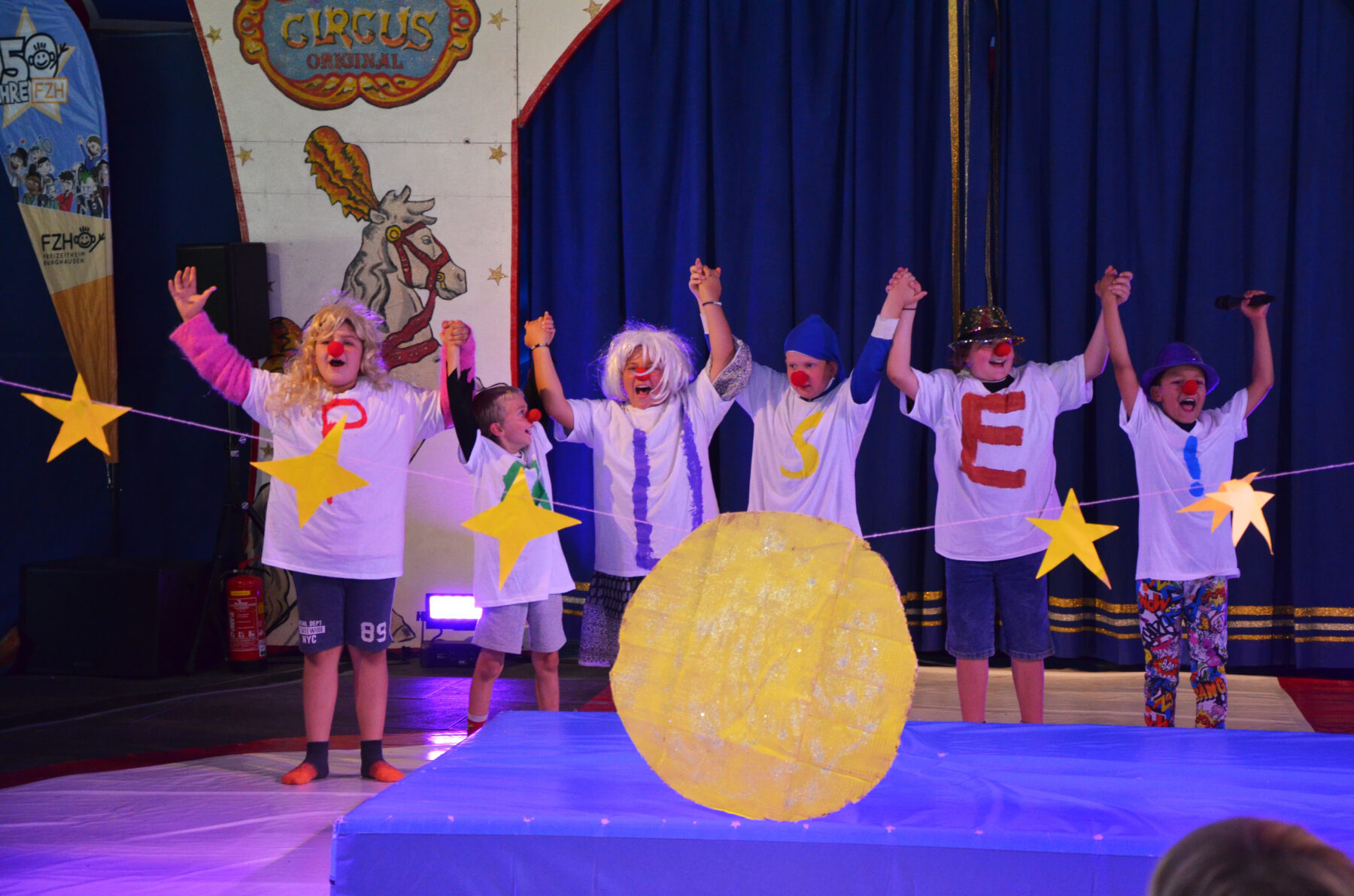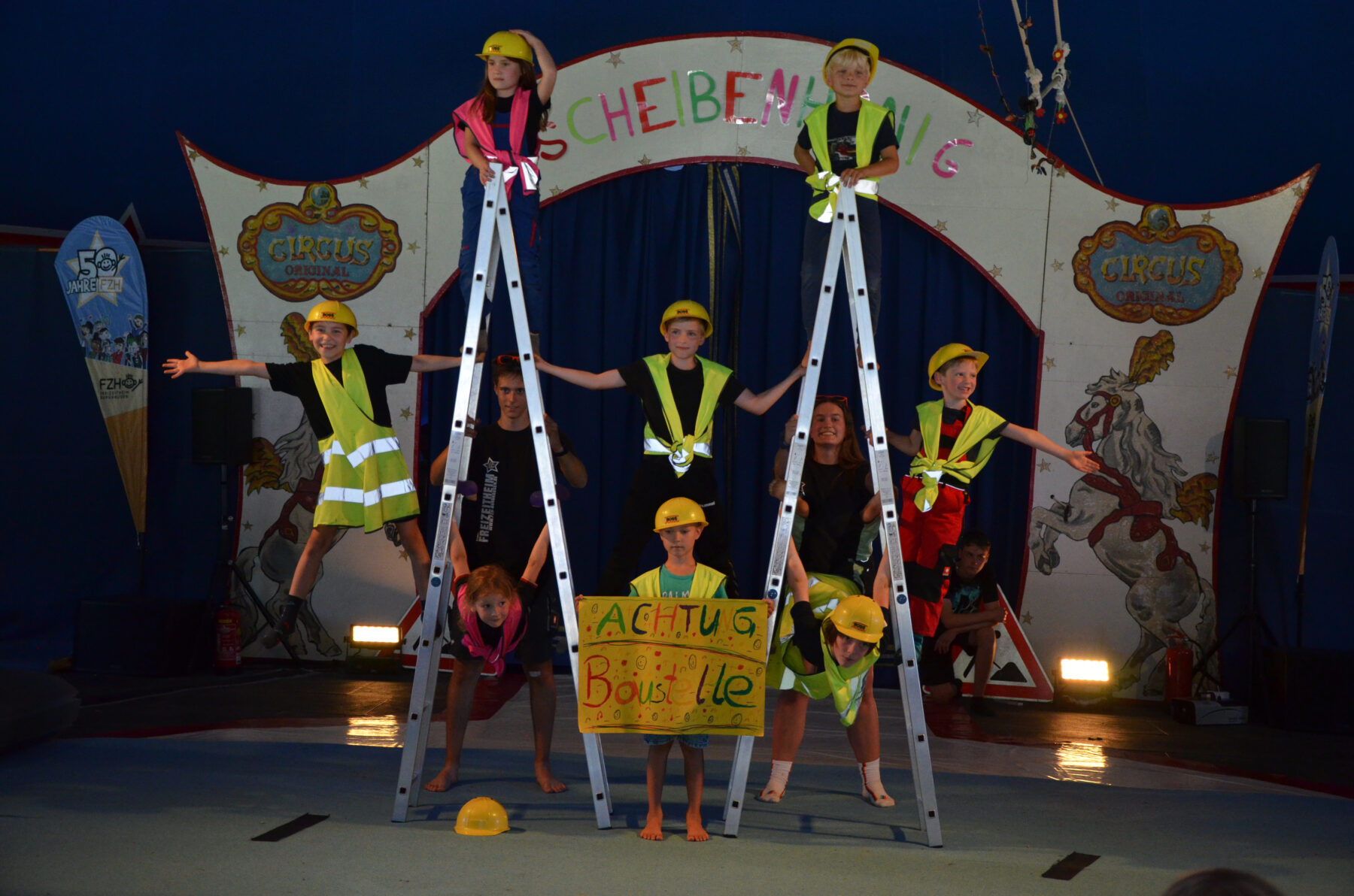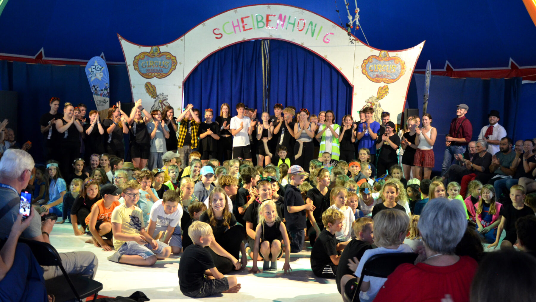 Jeweils am Freitagnachmittag führten die Kinder ihre Kunststücke im großen Zirkuszelt ihren Familien vor. Dabei konnte das Publikum über akrobatische, lustige und manchmal auch berührende Showeinlagen staunen. Die Mädchen und Buben flogen am Vertikaltuch durch die Luft, balancierten auf Bällen durch die Manege und die Clowns brachten alle zum Lachen. Ein Moderationsteam aus drei Kindern leitete durch die unterhaltsame Show. Am Ende der beiden Shows durften noch einmal alle Teilnehmer des Camps für eine letzte Shownummer in die Mitte des Zelts kommen. Die beiden Zirkuspädagogen Adam Harwig und Marcel Anslinger, Leiter des Zirkuscamps und des Freizeitheims, bedankten sich anschließend bei allen Beteiligten.