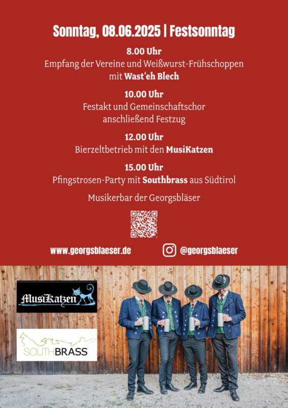 Am Sonntag, 8. Juni 2025, steht ab neun Uhr nach dem Empfang und einem Weißwurstfrühschoppen ein weiterer Höhepunkt an: Da fasziniert ein Gemeinschaftschor von etwa 1000 Musikern die Musikliebhaberinnen und Musikliebhaber. Ein Festzug mit Präsentationen von verschiedenen Märschen lässt die Fans dieser Musikrichtung höherschlagen. Im Anschluss laden die Veranstalter ins Bierzelt ein, wo die Musikatzen und Southbrass aufspielen.
