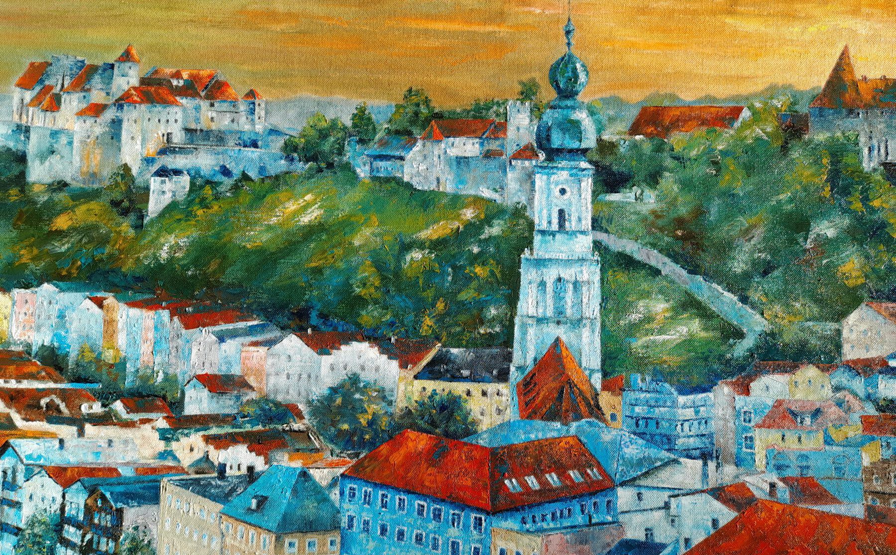 Das Bild zeigt eine farbenprächte Ausführung des Burghauser Stadtbildes von Alexander Borchardt.