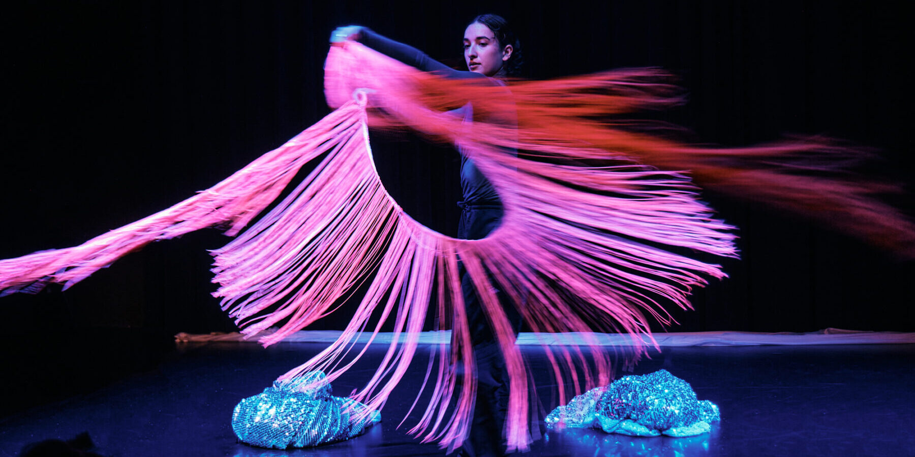 In Begleitung von live gespielter Gitarre erkunden zwei Performerinnen mit viel Gefühl verschiedenartige Textilien, drehen, wenden und werfen sie. Seidige Flügelschläge, schimmernde Plättchen – oder doch ein Faden, der scheint? Gleichmäßig windet sich die Spirale im Bogentanz und hinterlässt unsichtbare Spuren. Sanft und geschwind, freudig und ruhig – das wechselseitige Spiel bleibt stets im schwebenden Fluss.