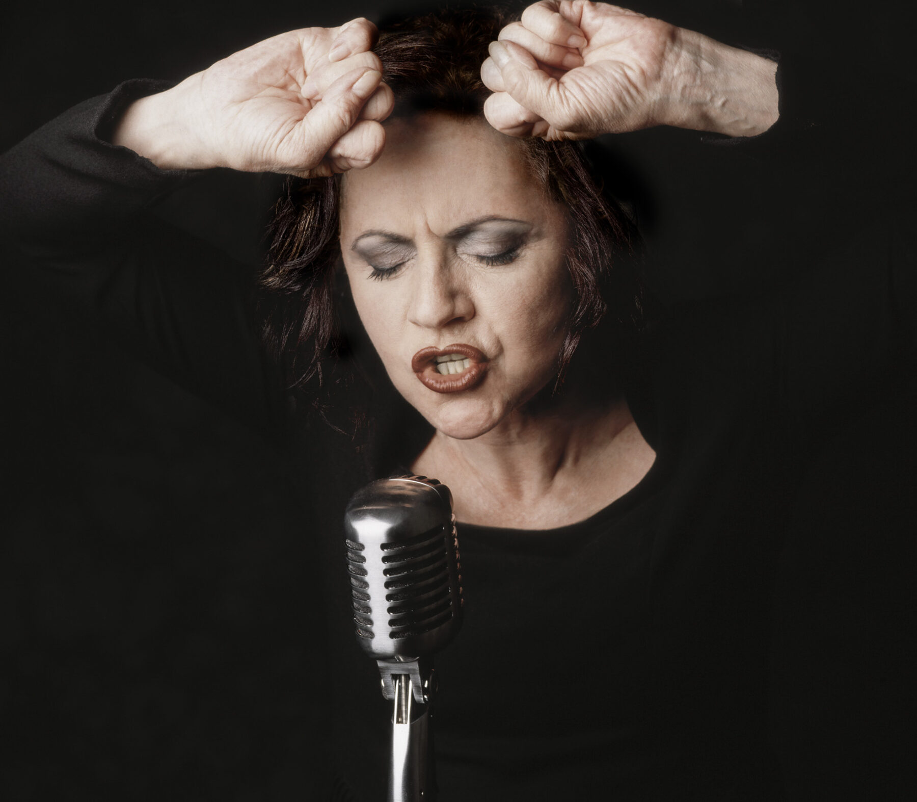 Schwarz gekleidet, mit leuchtend roten Lippen und ihrer leicht rauchigen, gefühlsintensiven Stimme singt sie die  vertrauten Chansons wie „La vie en rose“, „Non, je ne regrette rien“ und „Milord“ in der speziellen Bill-Färbung.