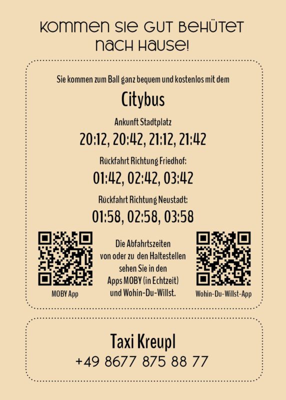 Bis 20 Uhr verkehrt der City-Bus Linie 1 + 2 und ab 20 Uhr bis 22 Uhr der Shuttle-Bus für den Ball der Hüte.