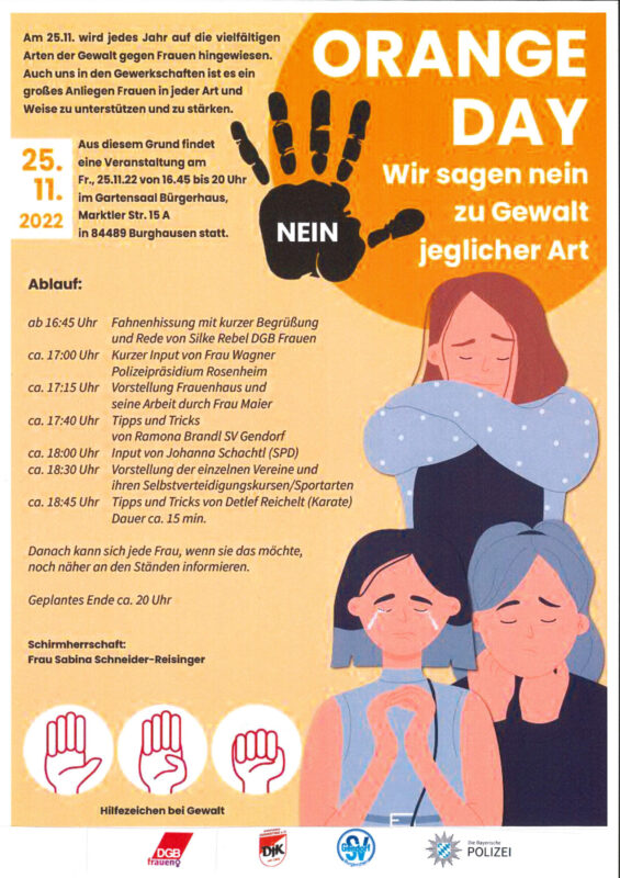 An diesem Tag wird auf jegliche Arten der Gewalt an Frauen aufmerksam gemacht. Leider ist es immer noch ein sehr aktuelles Problem in unserer Gesellschaft. Wir möchten mit allen interessierten Frauen über dieses Thema reden und wieder in den Vordergrund zu stellen. Starten wird das Programm mit einer Fahnnenhissung um 16:45 Uhr am Burghauser Bürgerhaus und ein paar Worten von Rebel Silke DGB Frauen. Im Anschluss daran, werden wir uns in den Gartensaal des Burghauser Bürgerhauses begeben und es werden einige Vorträe zu den verschiedenen Arten der Gewalt gehalten. Dafür haben wir einige Rednerinnen wie z.B. die Frau Wagner von der PI Rosenheim, die Frau Maier vom Frauenhaus und Frau Schachtl von der SPD eingeladen um mit uns darüber zu sprechen. Frau Brandl vom SV Gendorf und Herr Reichardt vom SV DJK Emmerting E.V. werden uns ein paar Tricks zeigen, wie Frau mit einer gefährlichen Situation umgehen könnte.