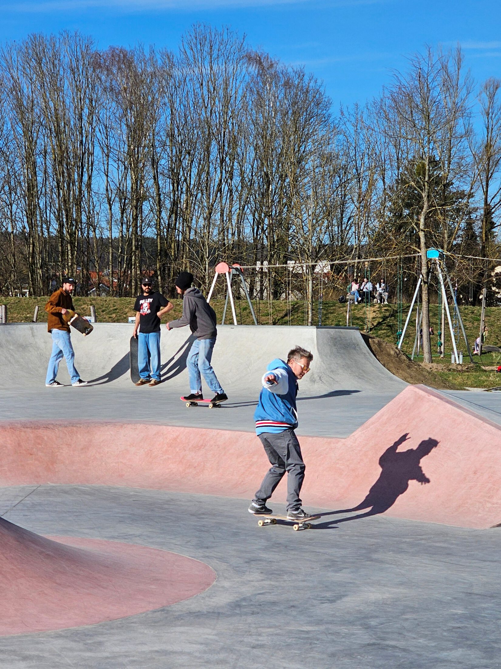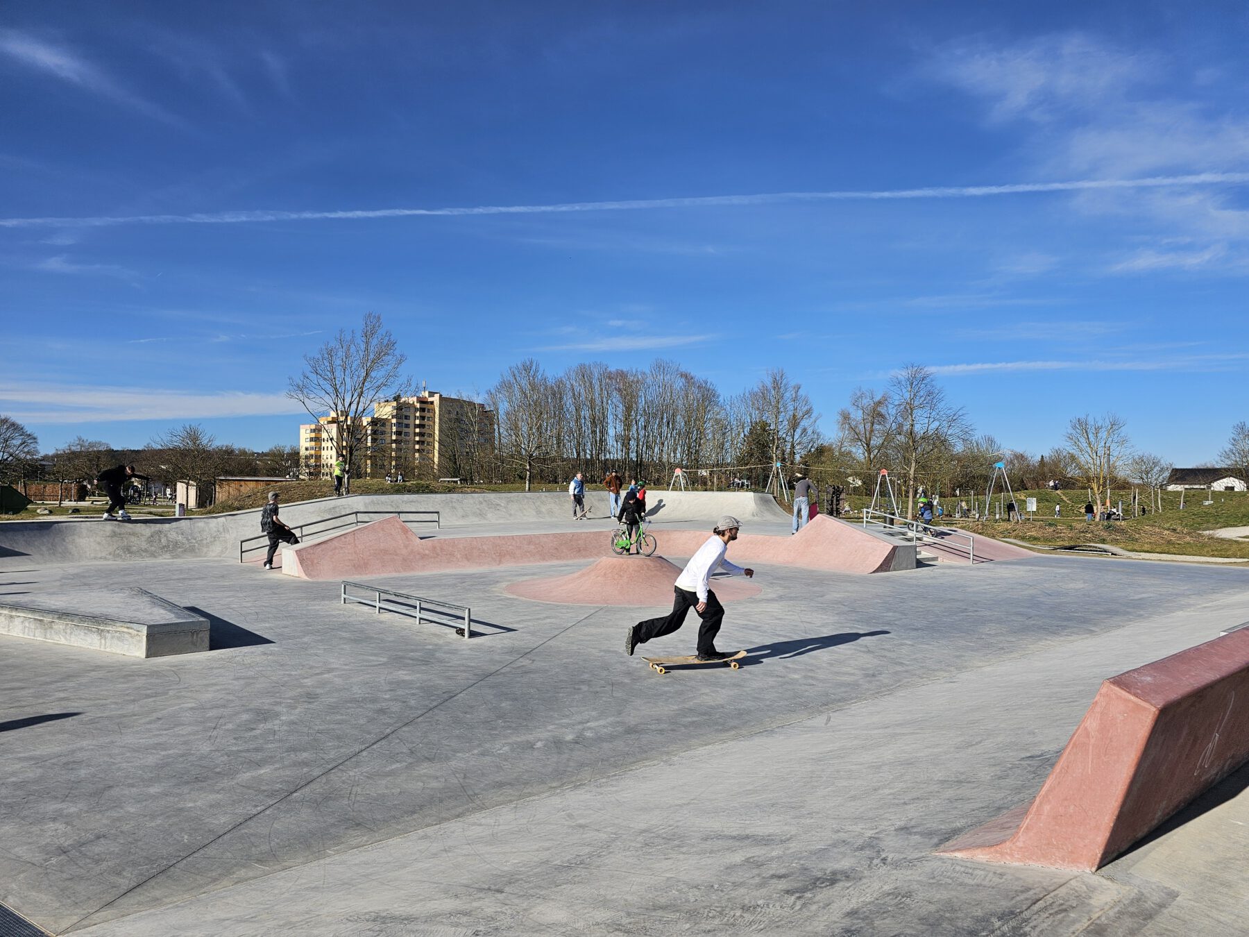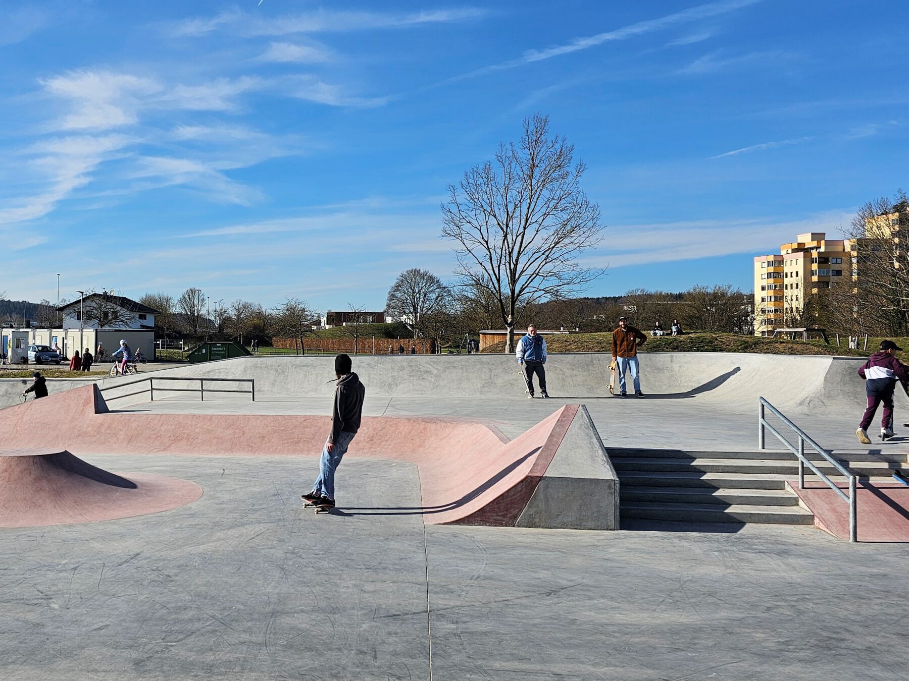 Seit Dezember 2023 ist der Skateplatz fertig. Seitdem tummeln sich, vor allem bei schönem Wetter, zahlreiche Skater und Biker auf der rund 550 qm großen betonierten Fläche. Auf verschieden hohen und steilen Rampen, Stufen und Geländern über sie ihre Tricks.