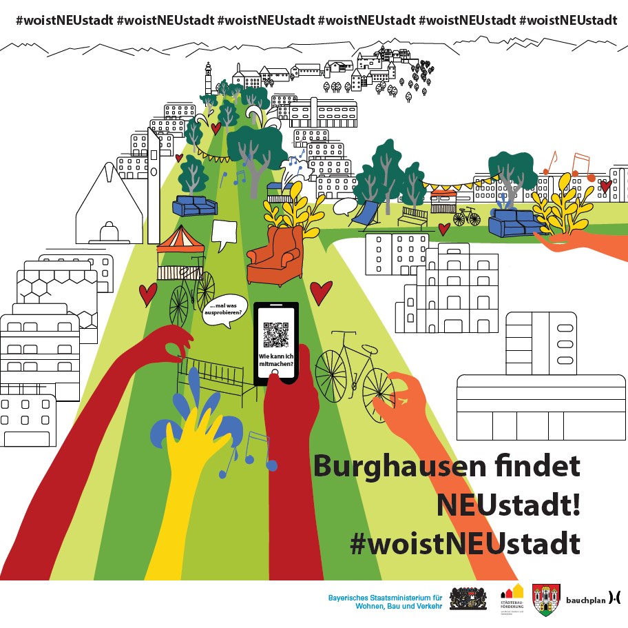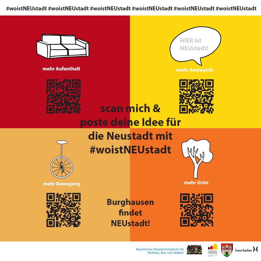 Schon im Vorfeld haben die Burghauser die Möglichkeit, Vorschläge einzusenden. Dazu hängen im gesamten Stadtgebiet Plakate mit QR-Codes aus. Wer seine Idee / Anregung unter dem #WoIstNeustadt postet, kann sich aktiv einbringen.
